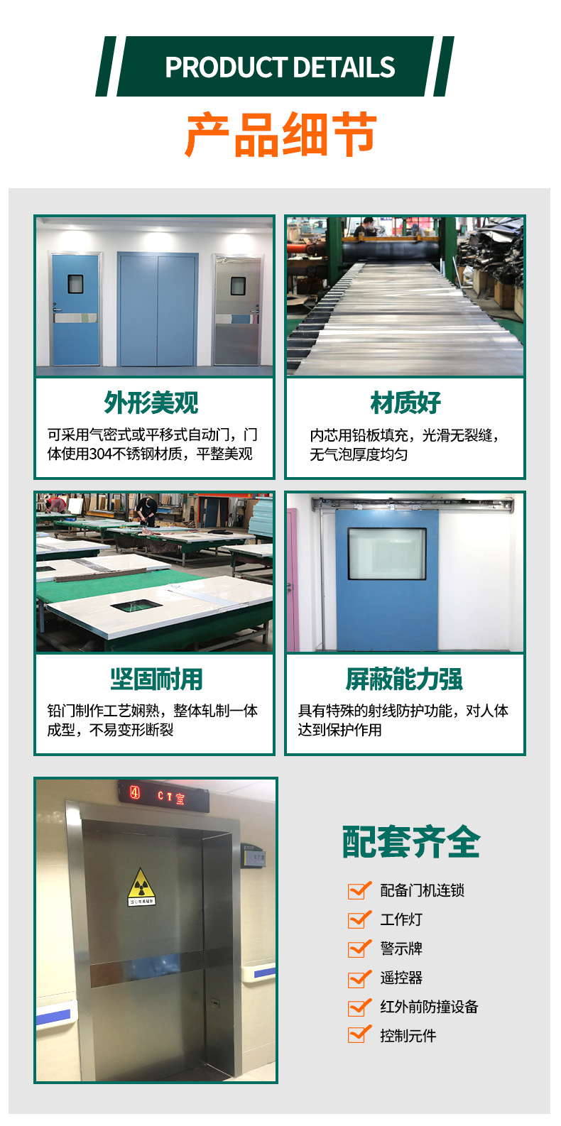 手動單開鉛門門洞的尺寸,手動、電動射線防御門的選擇,需求抵達幾個鉛當量的防御要求(要根據(jù)室內(nèi)源差異,鉛當量的巨細也不相同),門體內(nèi)的防御材質(zhì)采用(平常會采用鉛板,但有些為節(jié)儉本錢的廠家會采用其它材質(zhì)而達不到防御要求)。 門體表面裝束材質(zhì)的采用(平常是采用不銹鋼材質(zhì) ,手動單開防護鉛門,不銹鋼也分為201、304不銹鋼型號),ct室射線防護鉛門